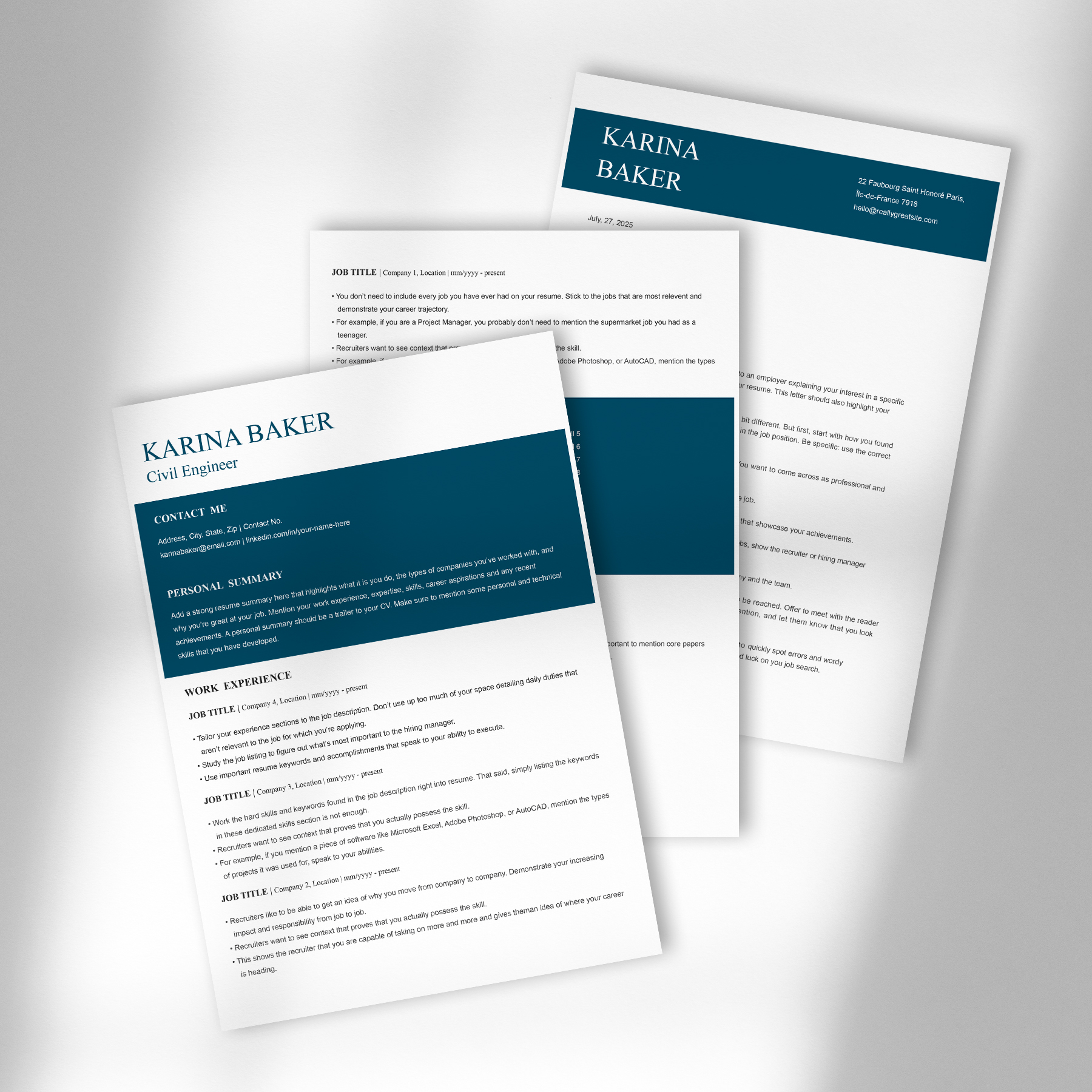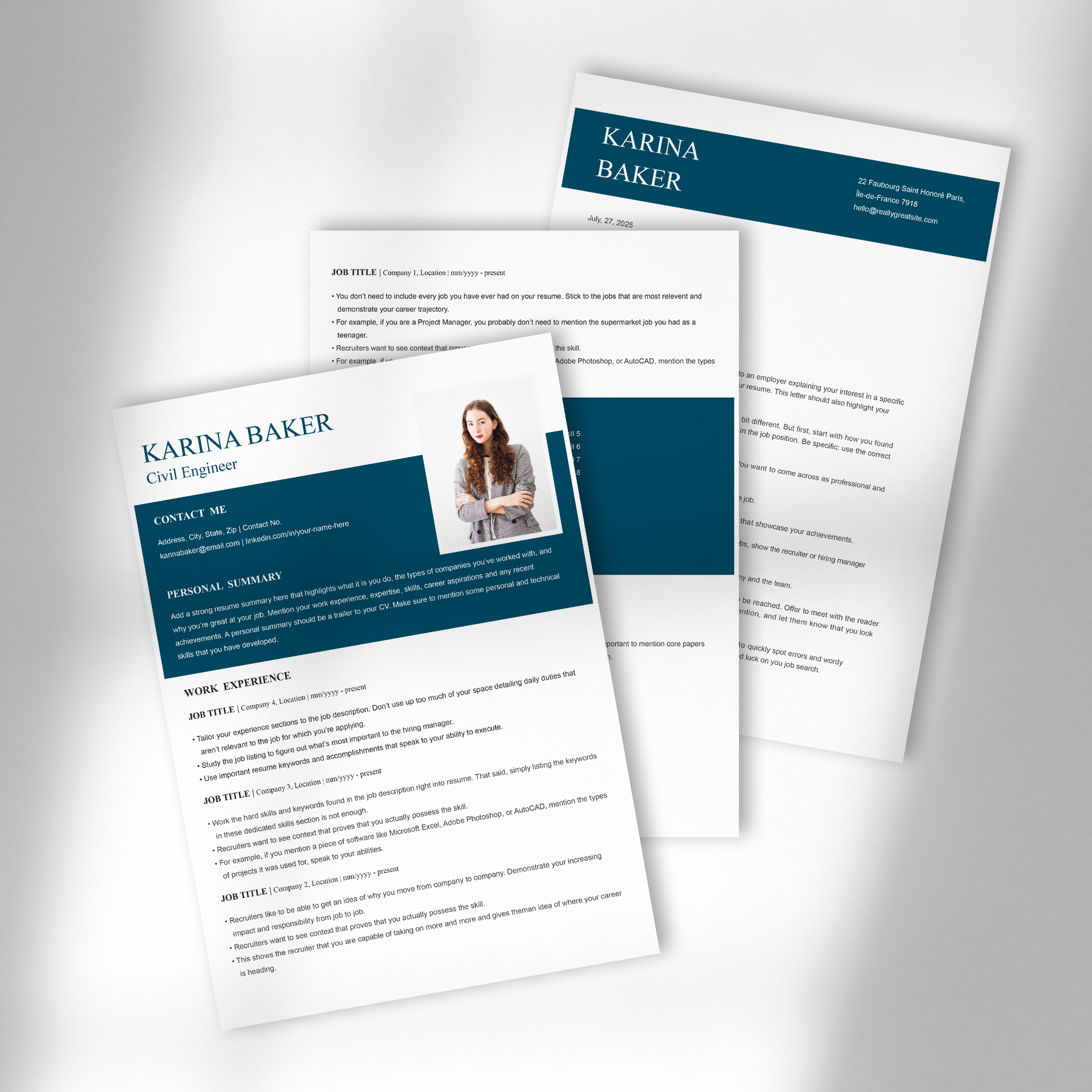 An ATS-Safe resume kit with resume and cover letter templates with photo and non-photo options to suit your specific career needs.