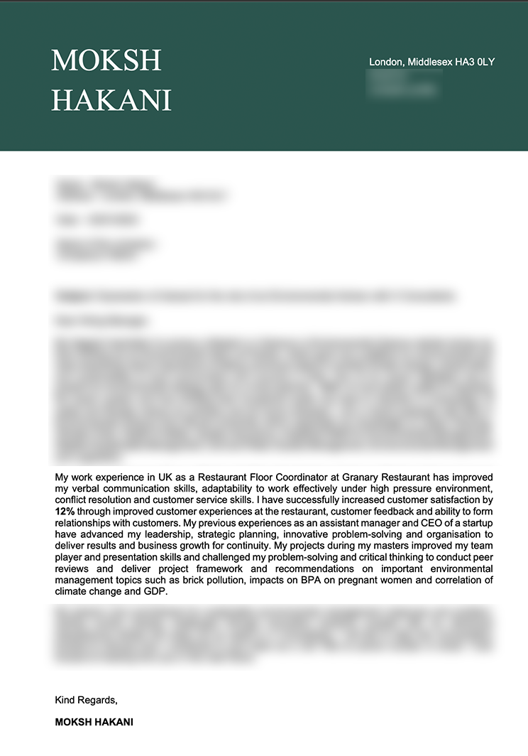 As an engineering graduate in the UK, we crafted an easily customisable cover letter to help him target environmental engineering roles inthe UK for his graduate and intern role.