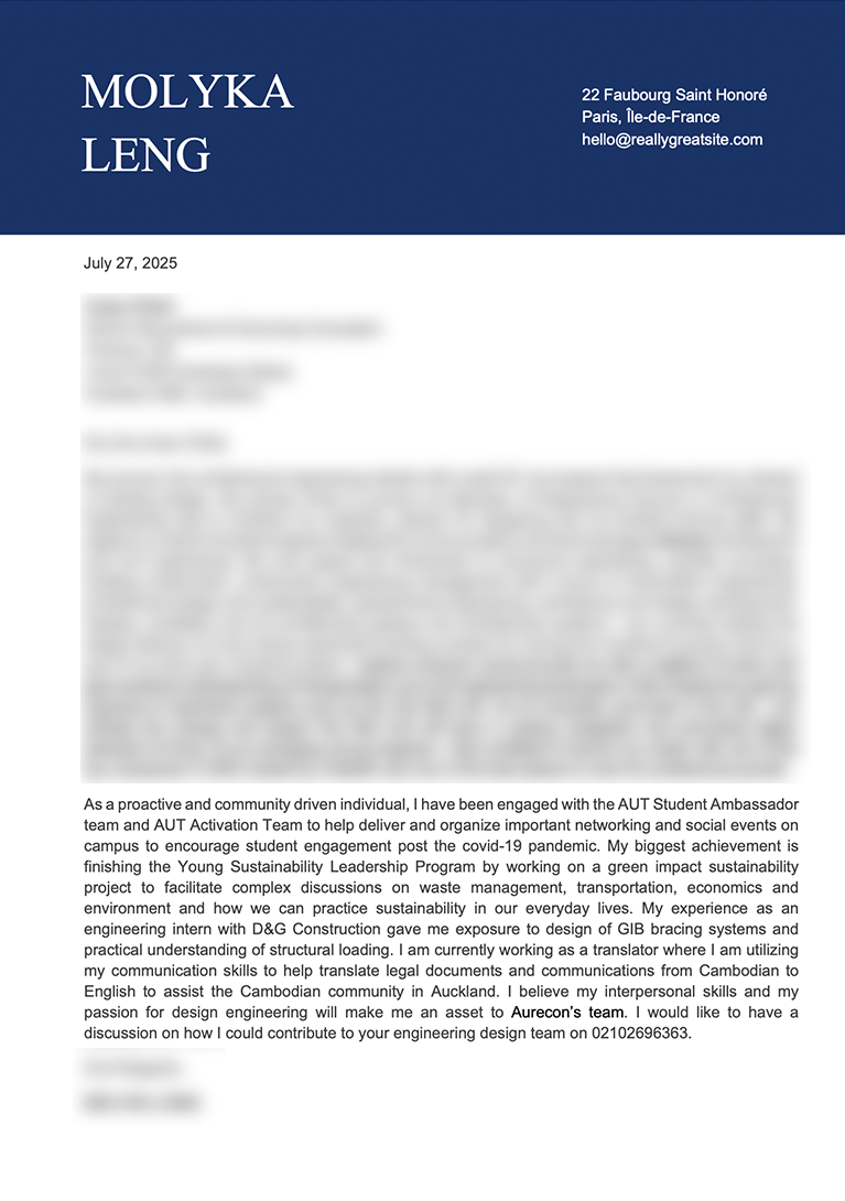 Molyka's cover letter was strategically written to target big consultancies such as Aurecon, AECOM for graduate engineer roles. Her experience of working as a translator and sustainability ambassador was highlighted to showcase her leadership skills. She is now working as a Facade Consultant in Auckland.