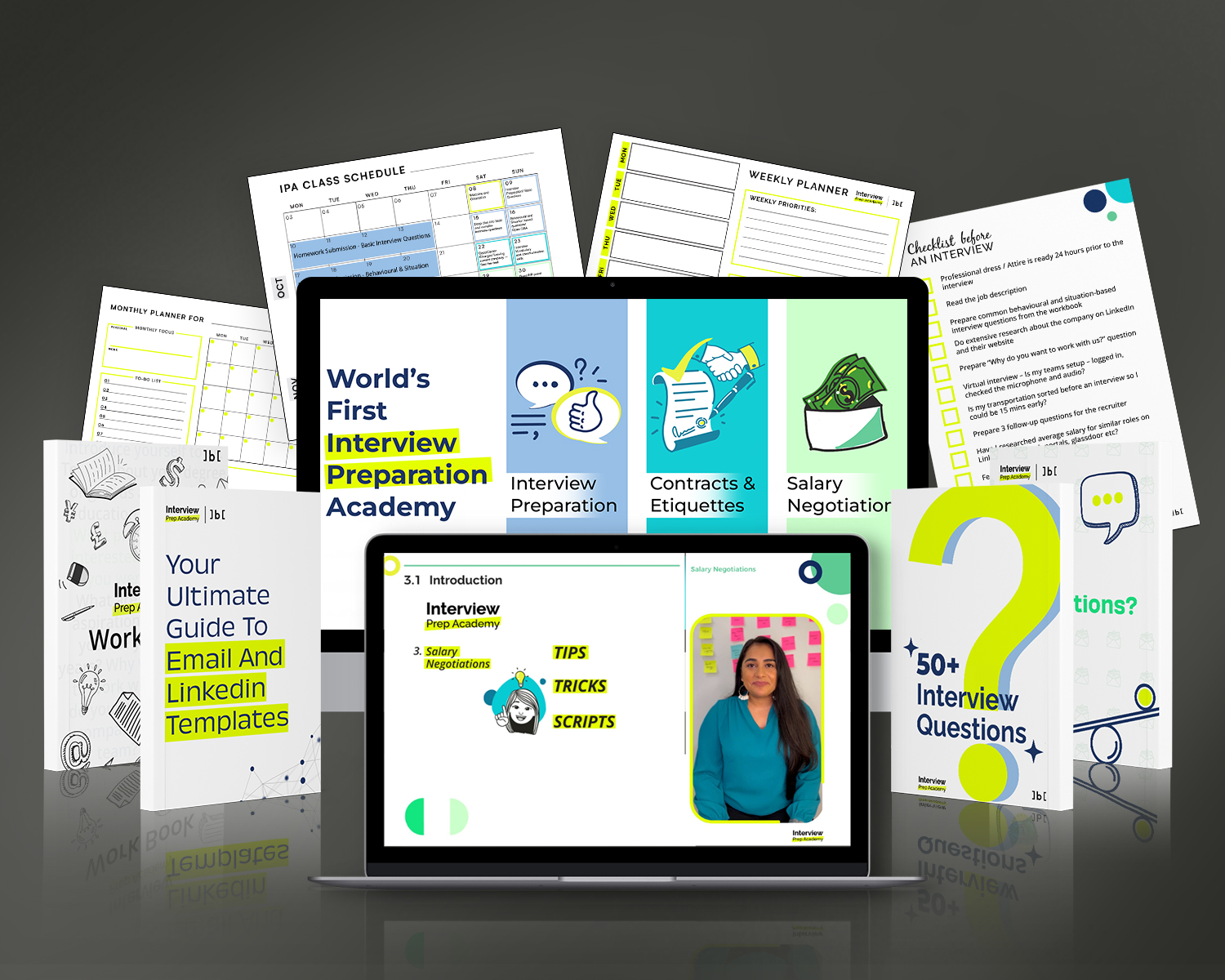 If you are looking for an all-in-one solution for your interviews, then THIS IS IT! Our interview ninja combo includes Ultimate Interview Scripts, 50+ Interview Questions Bank, Salary Negotiation Scripts and Vocabulary Essentials to transform your communication skills and answer delivery in an interview to sound confident, bold and effortless.